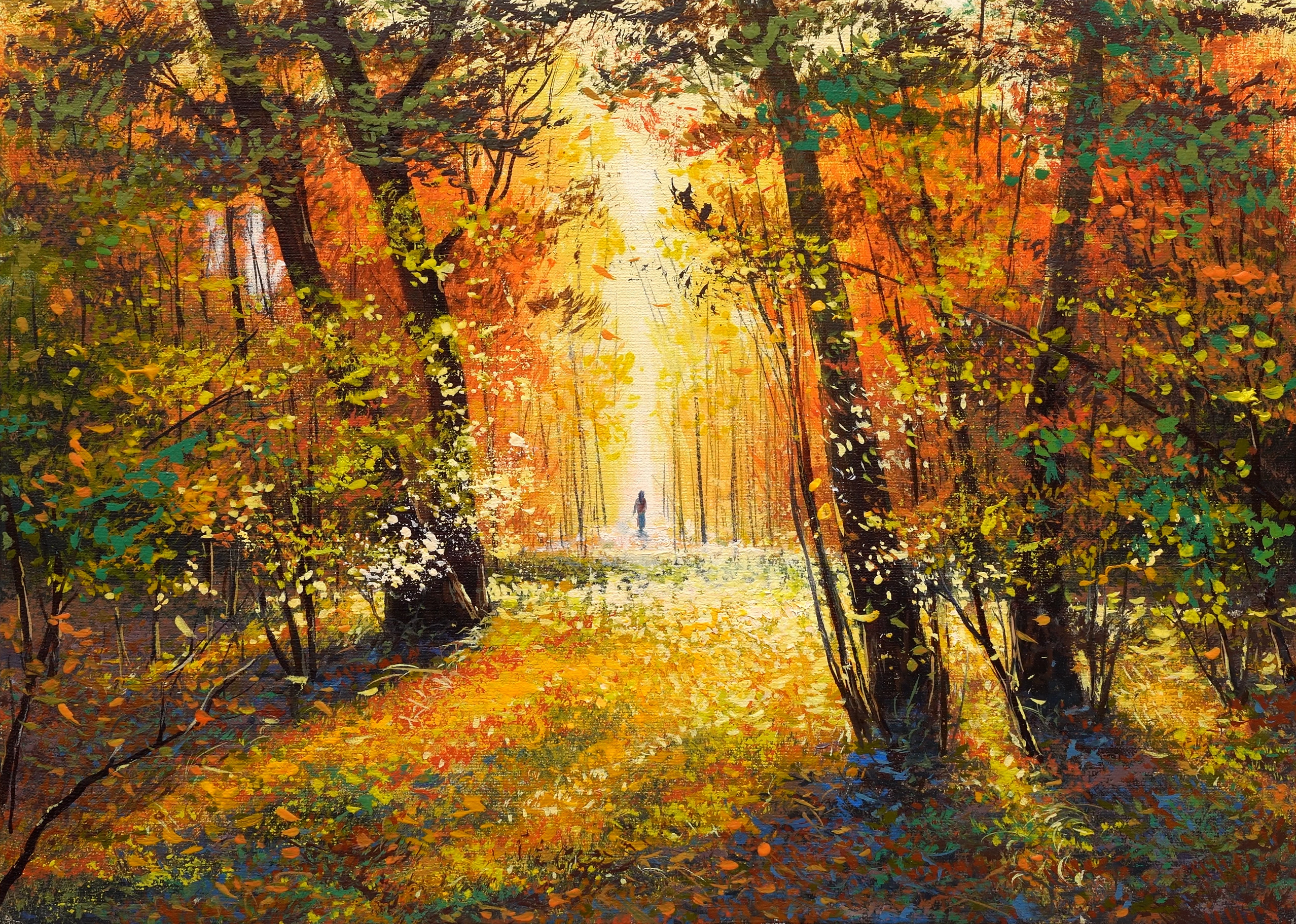 The painting is executed in the Impressionist style, characterized by dynamic brushwork, a vibrant autumnal palette, and an emotive interplay of light that evokes a sense of magic and warmth amidst the foliage.